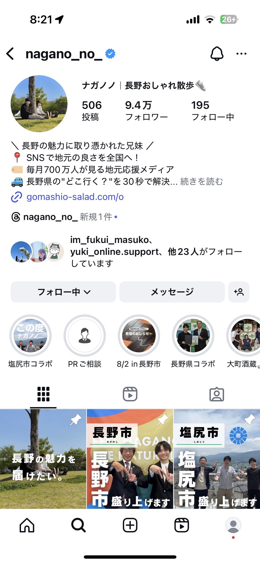 ナガノノは「長野県の魅力をもっと届ける」を叶えるために活動しております。SNSでの発信はもちろん、旅に関することや地域おこしに関することなど、お力になれることは何でも考えていきます。